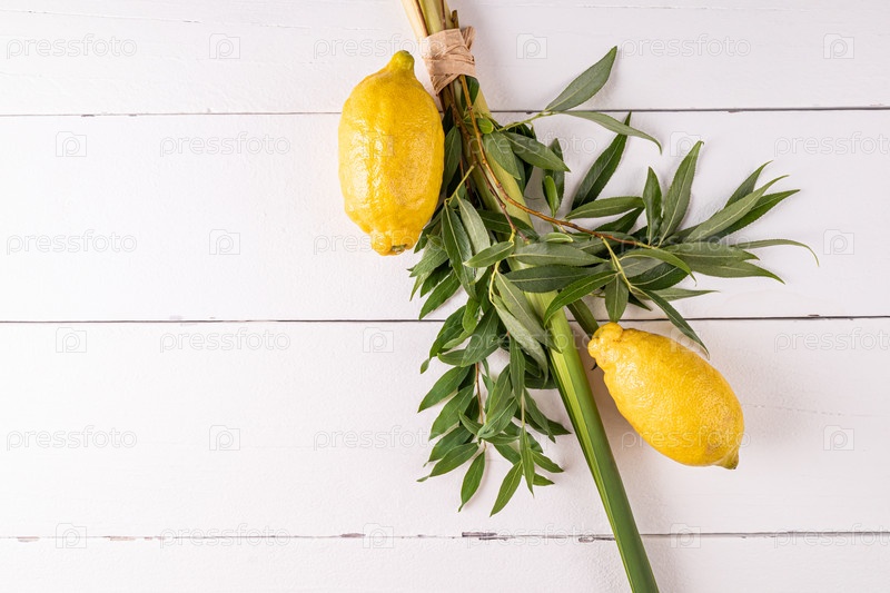 Зеленые ветви ивы, пальмовые ветви, цитрусовые на белом деревянном фоне. Концепция праздника Суккот. Копировальное пространство. вид сверху