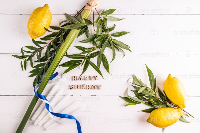 Праздничный фон для еврейского праздника Суккот с традиционными символами и свечами. Белый деревянный фон. Деревянные буквы Суккота