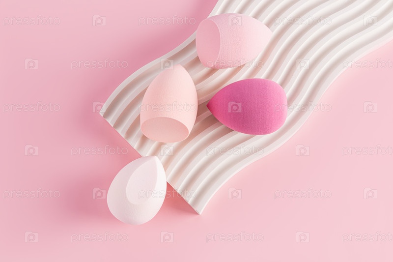 Четыре бьюти-блендера-губки в розовых оттенках на белом рельефном подиуме и розовом фоне. вид сверху. Концепция ухода и красоты. Инструмент для макияжа