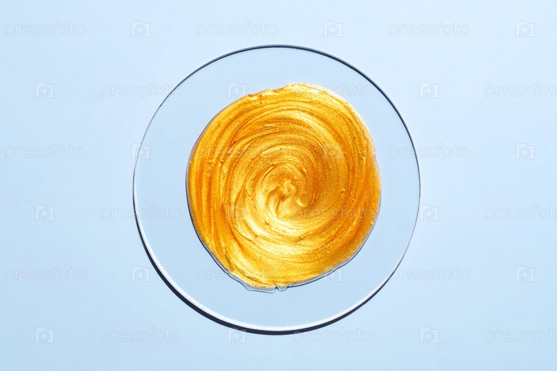 Образцы золотой маски для лица в чашке Петри на синем фоне. Текстура средства по уходу за кожей. Косметический мазок