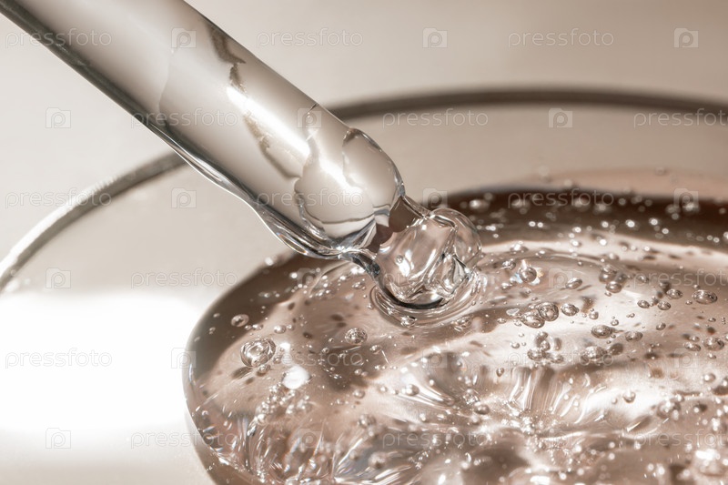 Косметическая пипетка с гелем для ухода за кожей на чашке Петри на бежевом фоне. Капля косметического масла падает из пипетки