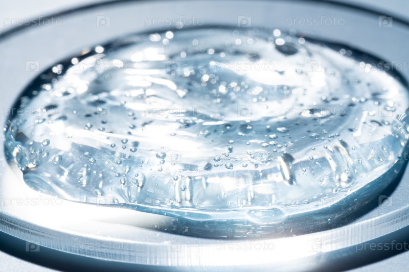 Капля или мазок косметики. Капля жидкого прозрачного геля с пузырьками на синем фоне на чашке Петри