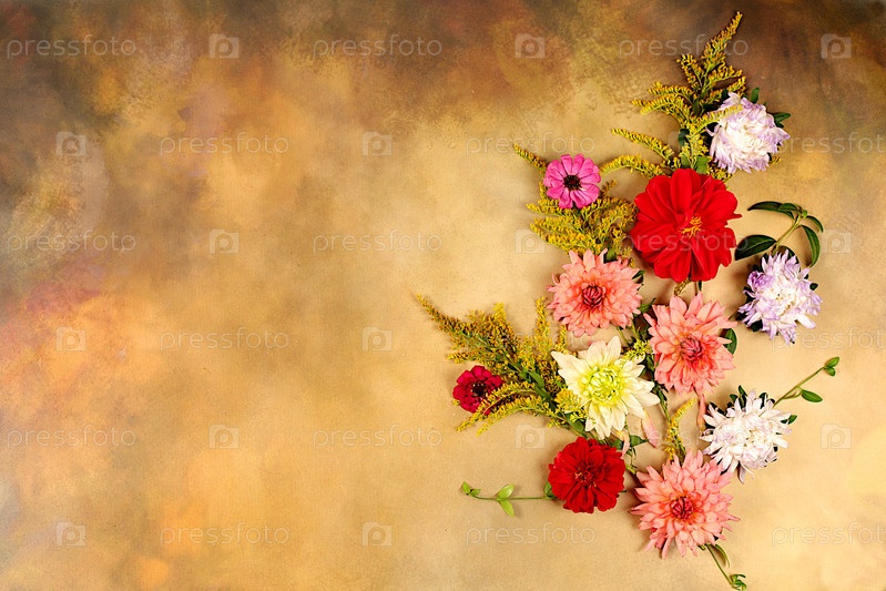 Абстрактная цветочная композиция, плоская планировка. Цветы георгины, астры, лютики на старом бетонном фоне, осенний баннер для рекламы, деревенский стиль, праздничная открытка, селективный фокус