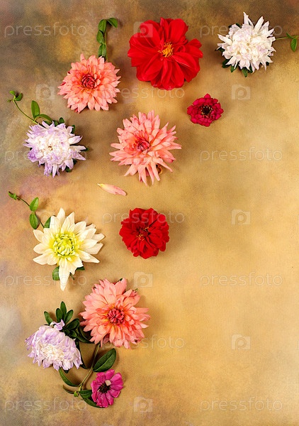 Абстрактная цветочная композиция, плоская планировка. Цветы георгины, астры, лютики на старом бетонном фоне, осенний баннер для рекламы, деревенский стиль, праздничная открытка, селективный фокус