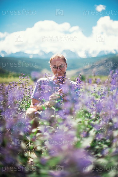 Счастливая молодая женщина в красивом поле диких розовых и фиолетовых цветов в летних горах Алтая