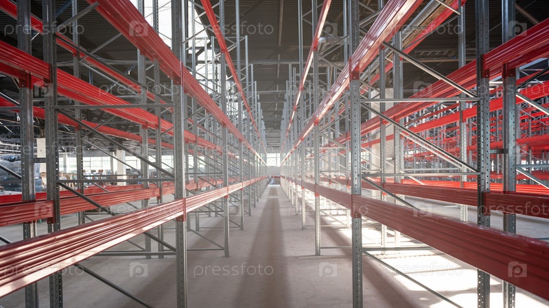 Склад с пустыми высокими стеллажами для поддонов, система стеллажей