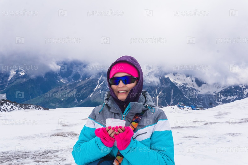 Альпинистка согревается горячим чаем на заснеженном склоне Эльбруса по пути к вершине