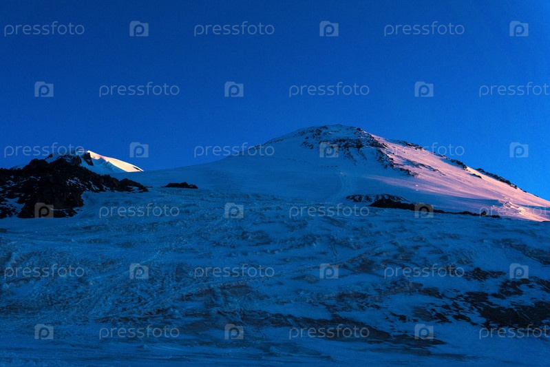 Вид на снежные вершины Эльбруса в лучах раннего рассвета. Эльбрус — самая высокая вершина Европы