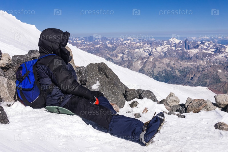 Альпинист отдыхает, сидя на заснеженном склоне среди скал в высокогорье