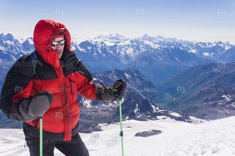 Мужчина-альпинист на заснеженном склоне горы Эльбрус на пути к вершине