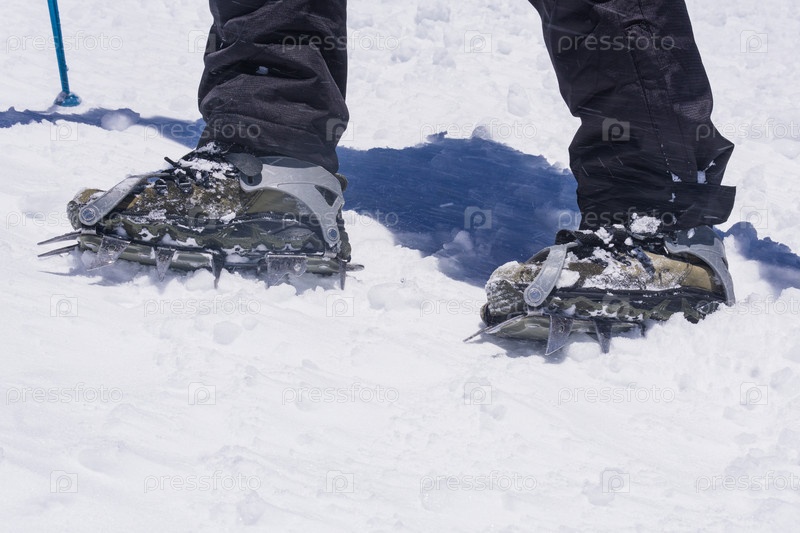 Ноги альпиниста, стоящего на горном леднике, в альпинистских ботинках, оснащенных кошками