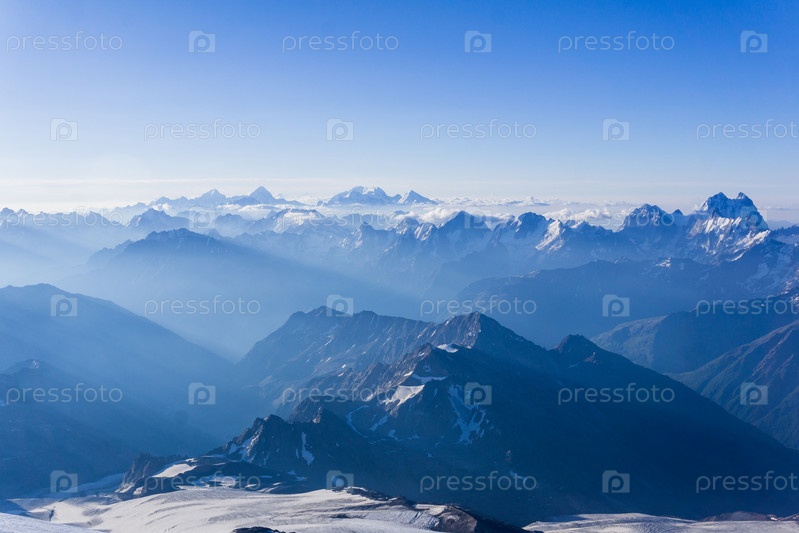 Вид с высокогорного ледника на туманные горы в лучах рассвета