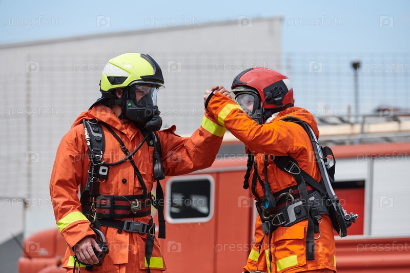 Сплоченная команда пожарных, облаченных в форму, принимает участие в душевном праздновании, отмеченном торжественными салютами и криками «ура», олицетворяя радость и благодарность после успешного завершения сложной пожарной операции