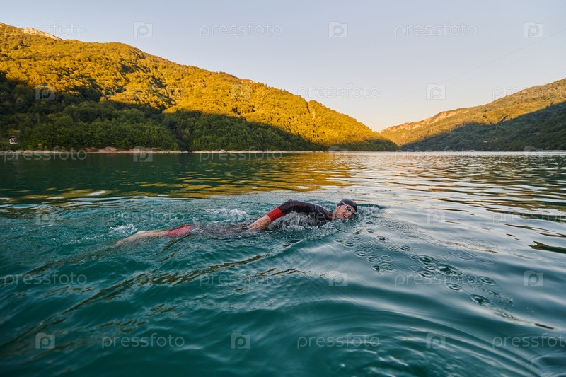 Триатлонист плывет по озеру на рассвете в гидрокостюме