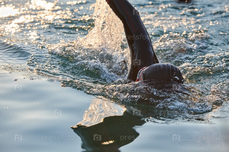 Триатлонист плывет по озеру на рассвете в гидрокостюме
