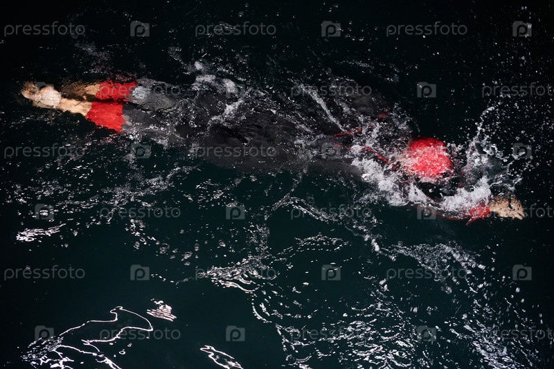 Целеустремленный профессиональный триатлонист проходит интенсивные ночные тренировки в холодной воде, демонстрируя самоотверженность и выносливость в рамках подготовки к предстоящим соревнованиям по триатлону