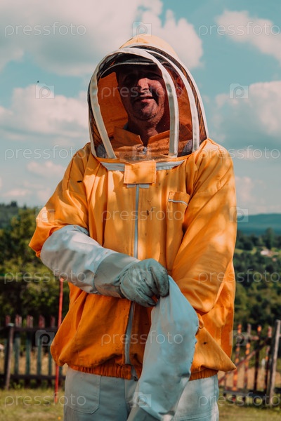Пчеловод надевает защитный костюм и готовится войти на пасеку