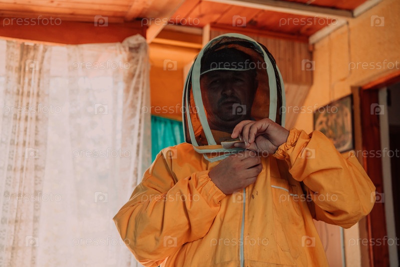Пчеловод надевает защитный костюм и готовится войти на пасеку
