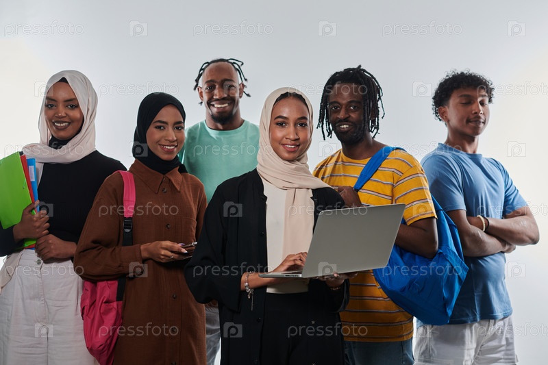 Группа разнообразных студентов занимается современными образовательными практиками, используя разнообразные технологические инструменты, такие как ноутбуки, планшеты и смартфоны, на чистом белом фоне, демонстрируя современный подход к совместному обучению