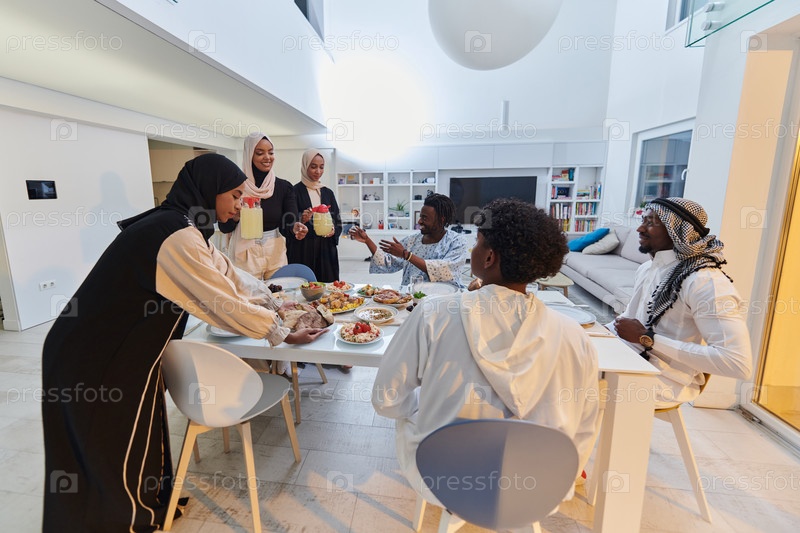 В священный месяц Рамадан мусульманская семья радостно собирается за столом, с нетерпением ожидая общего ифтара, участвуя в приготовлении общей трапезы и объединяясь в предвкушении коллективной молитвы, воплощая дух единения, преданности и культурного пра