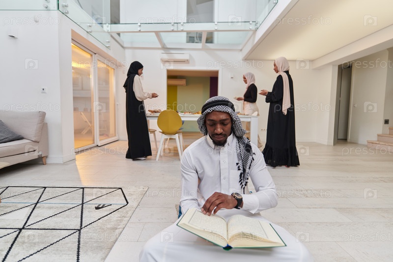 В священный месяц Рамадан афроамериканский мусульманин, поглощенный чтением Священного Корана, стоит на фоне декораций, на которых три женщины в хиджабах готовят и подают еду для ифтара, изображая сцену духовной преданности, культурного единства и обществ