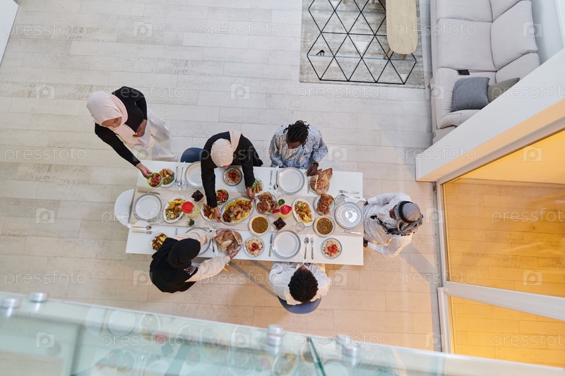 Вид сверху на мусульманскую семью, которая радостно собирается за столом, с нетерпением ожидая общего ифтара, занимаясь приготовлением общей трапезы и объединяясь в предвкушении коллективной молитвы, олицетворяя дух единения, преданности и культурного пра