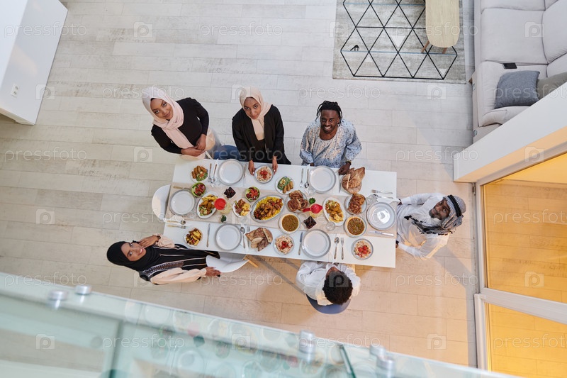 Вид сверху на мусульманскую семью, которая радостно собирается за столом, с нетерпением ожидая общего ифтара, занимаясь приготовлением общей трапезы и объединяясь в предвкушении коллективной молитвы, олицетворяя дух единения, преданности и культурного пра