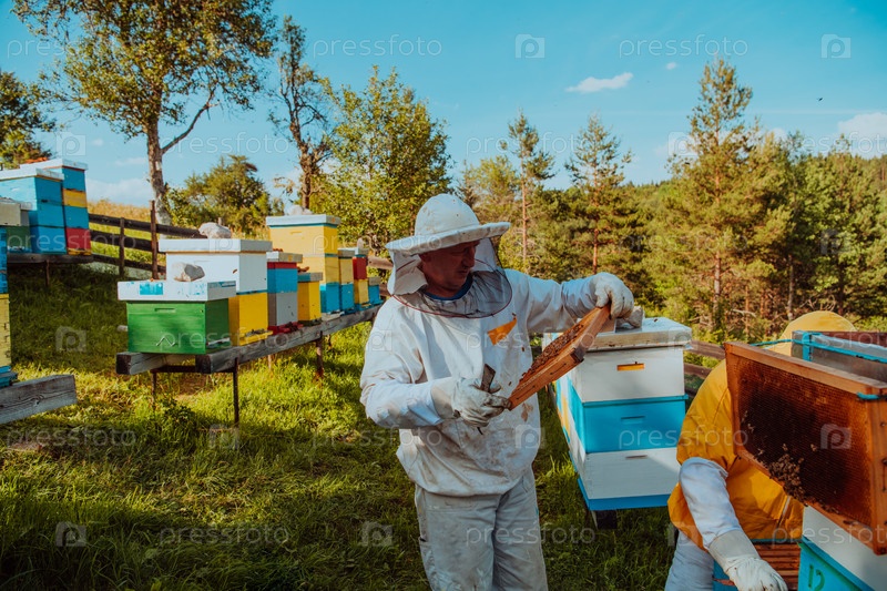 Пчеловоды проверяют мед на рамке улья в поле. Владельцы малого бизнеса на пасеке. Производитель натуральной здоровой пищи работает с пчелами и ульями на пасеке