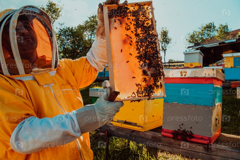 Общий план пчеловода, держащего рамку улья, наполненную медом, на фоне солнечного света на поле, полном цветов