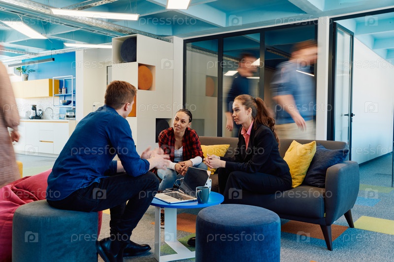 Многонациональная команда стартапа на встрече в современном ярком офисе коворкинга с открытым пространством. Мозговой штурм, работа на ноутбуке. Группа коллег, гуляющих в размытом движении