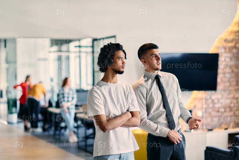 Группа коллег, включая афроамериканского бизнесмена и молодого лидера в рубашке и галстуке, позируют вместе в современном офисе коворкинг-центра, представляя собой динамичное сочетание профессионализма и сотрудничества
