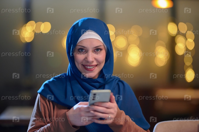 Красивая европейская мусульманка, облаченная в хиджаб, использует свой смартфон, чтобы быстро подготовиться к ифтару во время священного месяца Рамадан, воплощая в своем соблюдении сочетание традиций и современности