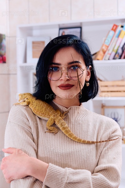 Женщина и ее питомцы: бородатая агама и палочник