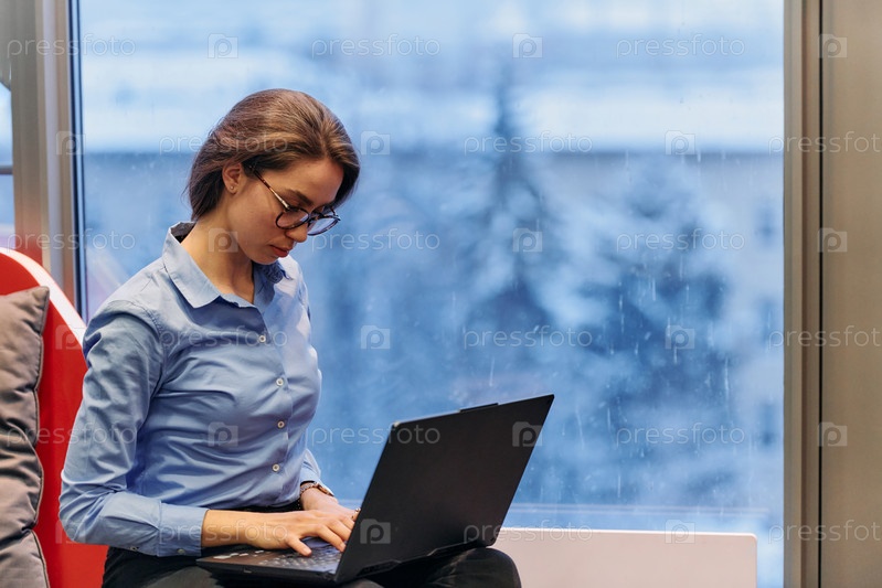 Деловая женщина пользуется ноутбуком, сидя у окна большого корпоративного здания, на фоне которого открывается живописный вид на городской пейзаж