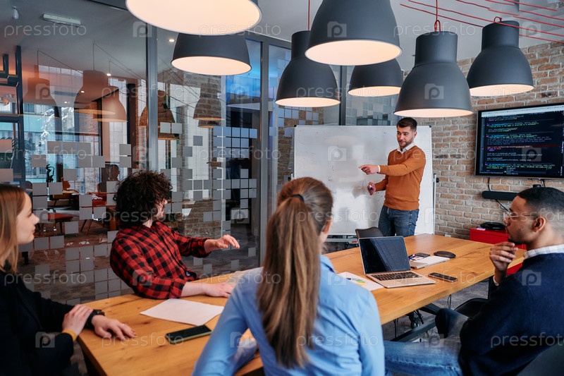 В корпоративной обстановке бизнесмен проводит совещание, страстно представляя бизнес-план своей внимательной команде, способствуя сотрудничеству и стратегическому мышлению