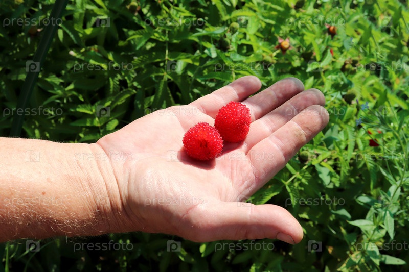 Две спелые ягоды тибетской малины на мужской ладони на фоне сада
