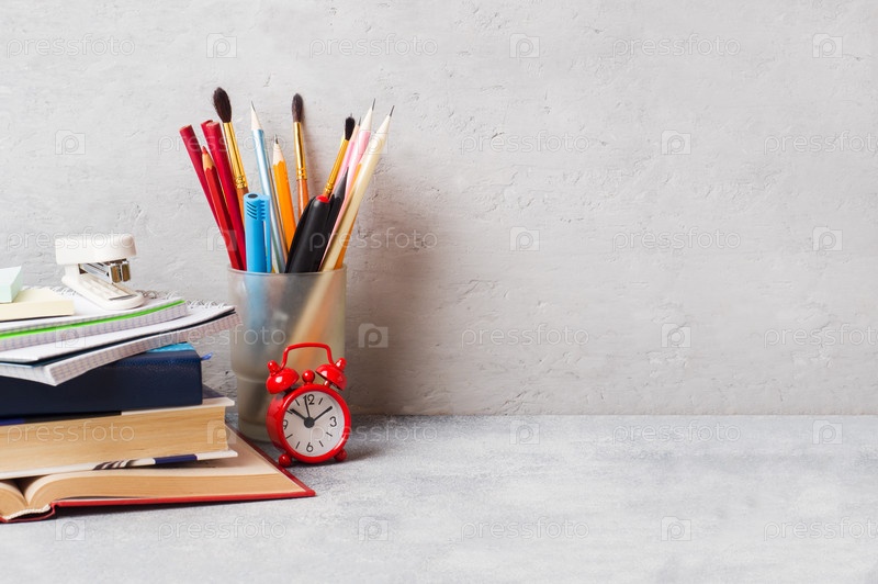 Школьные принадлежности, книги, тетради, карандаши на сером фоне с местом для копирования