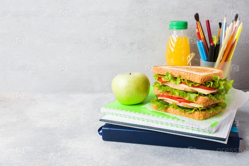 Здоровый обед для школы с сэндвичем, свежим яблоком и апельсиновым соком. Ассорти из красочных школьных принадлежностей. Копировальное пространство