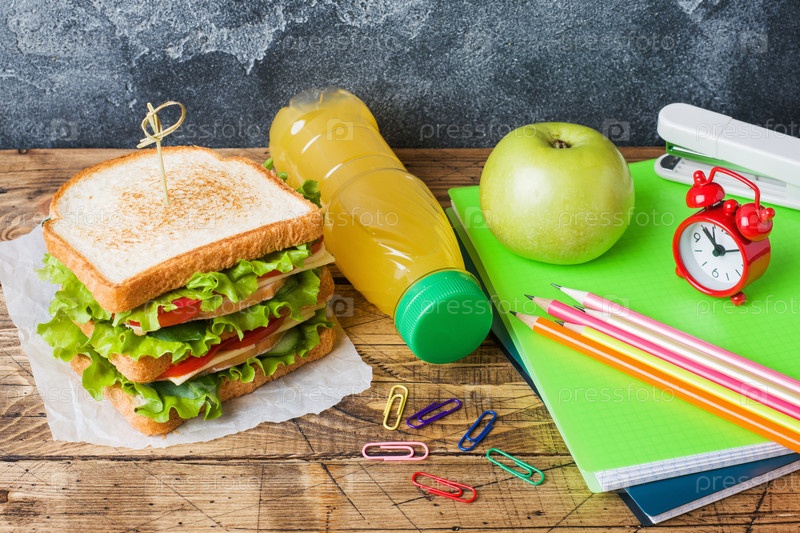 Здоровый обед для школы с сэндвичем, свежим яблоком и апельсиновым соком. Ассорти из красочных школьных принадлежностей. Копировальное пространство