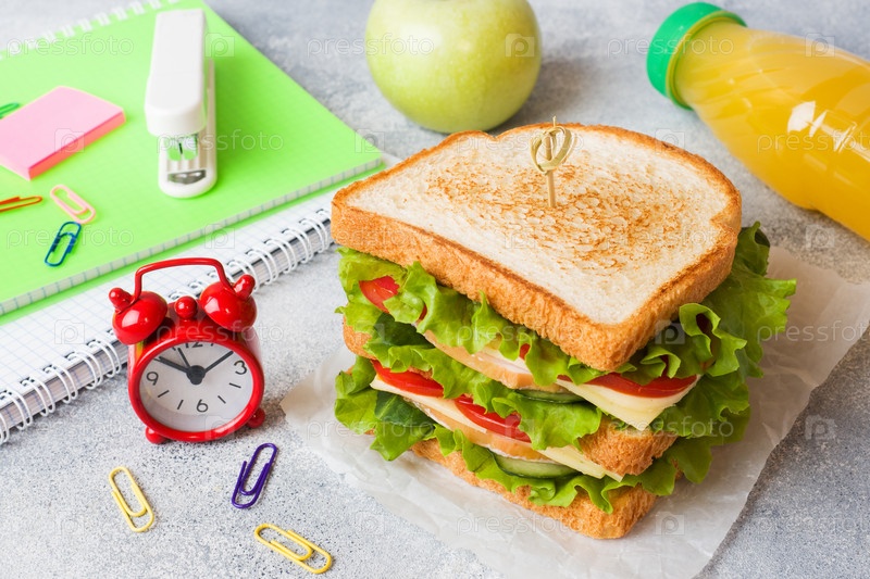 Здоровый обед для школы с сэндвичем, свежим яблоком и апельсиновым соком. Ассорти из красочных школьных принадлежностей. Копировальное пространство