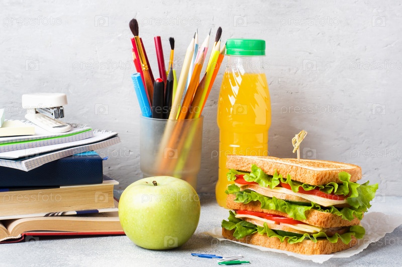 Здоровый обед для школы с сэндвичем, свежим яблоком и апельсиновым соком. Ассорти из красочных школьных принадлежностей. Копировальное пространство