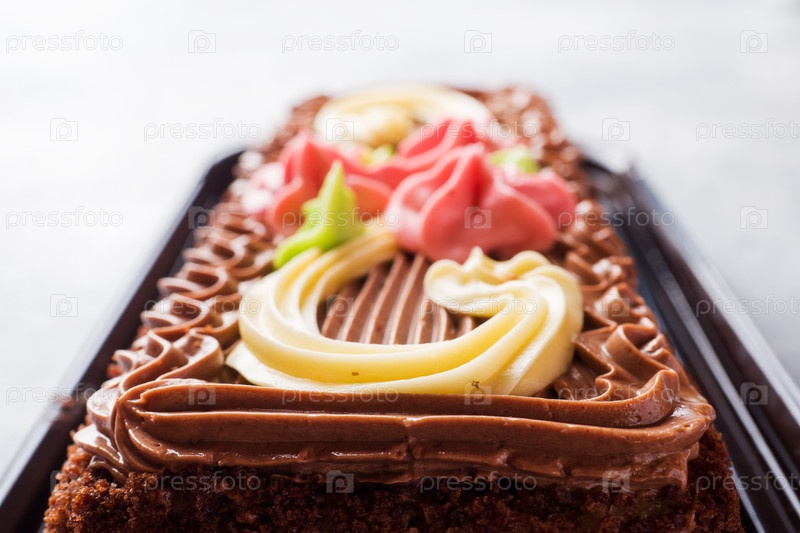 Шоколадный прямоугольный торт, украшенный кремовыми розами на светлом столе. Сладкая еда — кондитерский бизнес. копировальное пространство Избирательный фокус