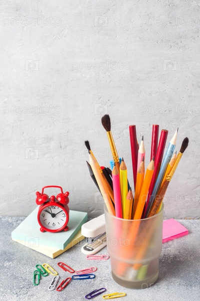 Школьные принадлежности, набор маркеров-карандашей в стакане на сером столе с копией пространства. Концептуальная школа