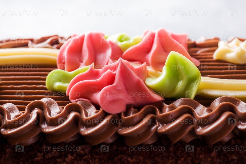 Шоколадный прямоугольный торт, украшенный кремовыми розами на светлом столе. Сладкая еда — кондитерский бизнес. копировальное пространство Избирательный фокус