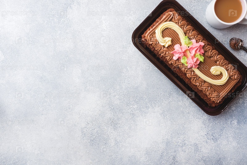 Шоколадный прямоугольный торт, украшенный кремовыми розами на сером столе. Сладкая еда — кондитерский бизнес. Вид сверху, копировальное пространство
