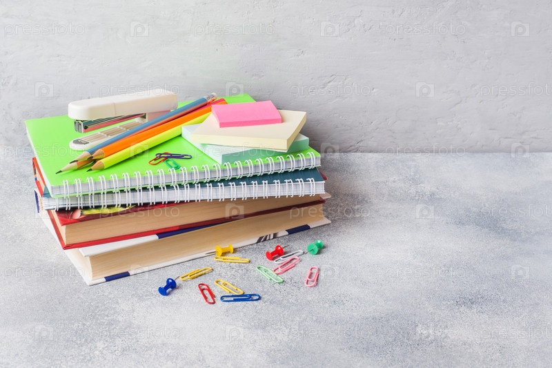 Школьные принадлежности, книги, тетради, карандаши на сером фоне с местом для копирования