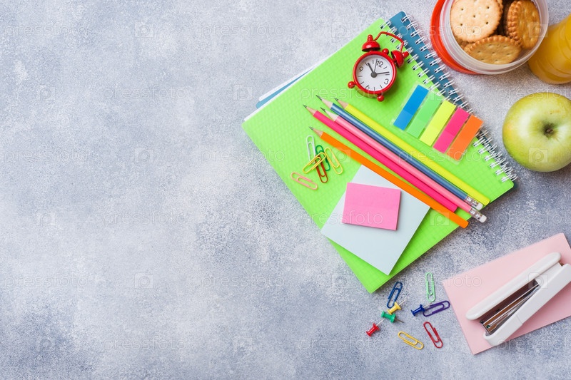Школьные принадлежности и крекеры на завтрак, апельсиновый сок и свежее яблоко на сером столе с копировальным пространством. концептуальная школа