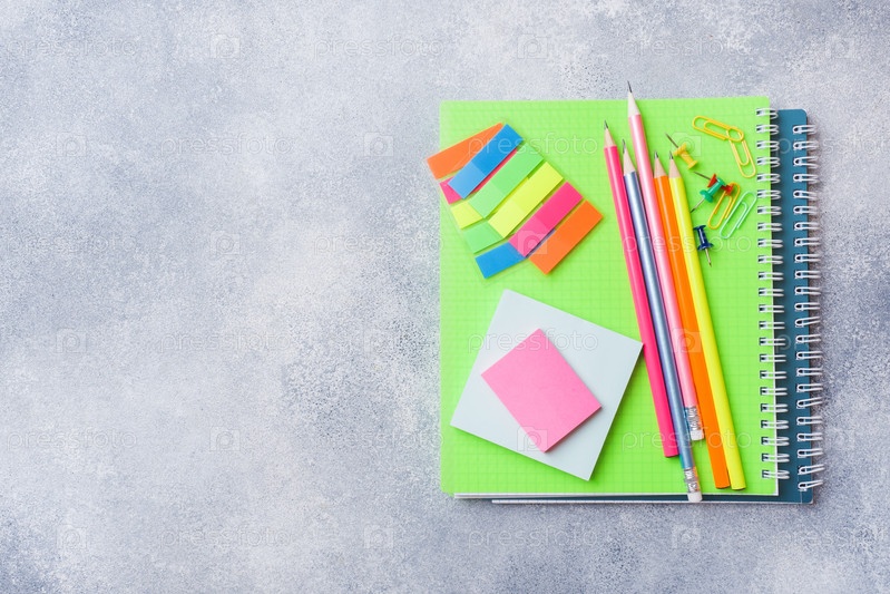 Школьные принадлежности, тетради, карандаши на сером фоне с местом для копирования
