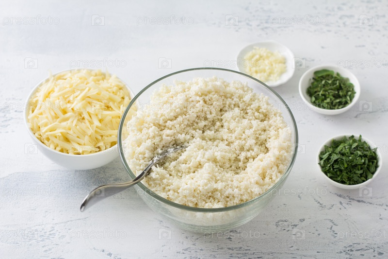 Измельченная цветная капуста, рис из цветной капусты или кускус из цветной капусты, окруженные рубленой зеленью, чесноком и тертым сыром на светло-голубом столе. Готовим вкусную веганскую здоровую пищу