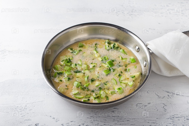 Жареные цуккини с петрушкой, залитые яйцами, на сковороде на светло-сером столе. Готовим вкусный омлет